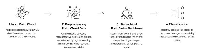 - Native 3D Processing: Unlike traditional methods that often convert the 3D point cloud into grids or images, the Akida PointNet++ model works natively on the raw point sets. This preserves data integrity while maximizing efficiency.