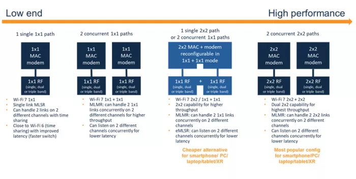 Finally as mentioned earlier the full 2×2 MLMR serves the premium end of this range. The range of configurations may seem a bit confusing at first but makes perfect sense for OEMs who need to serve different markets at the right cost/power/performance point while also future proofing for Wi-Fi advances and being able to take advantage of the marketing buzz around Wi-Fi 7.