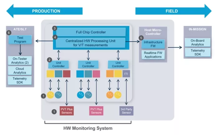 The system introduces a complete, silicon-proven platform, not a collection of partial components. It eliminates customer-built logic and missing pieces by providing a single infrastructure that supports both test and mission-mode operation. Hardware processing is built in, enabling scalable monitoring across the entire chip while minimizing bandwidth and integration effort. The system is automatically compiled with the required firmware, interfaces, and verification collateral, making it ready to deploy. Integration requires only a small number of low-frequency interface signals, minimizing routing impact and simplifying physical implementation.