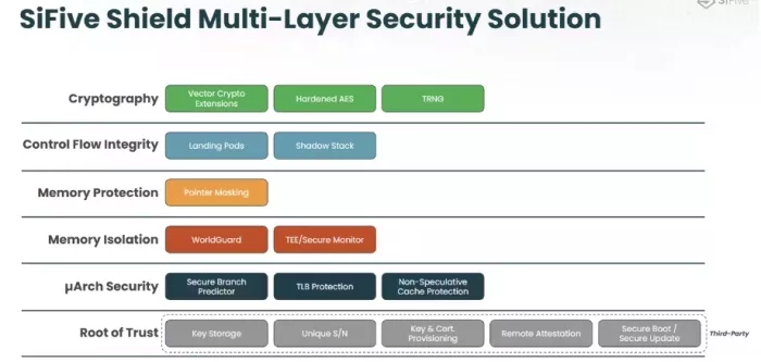 Let’s look at what the X100 can provide in this capacity. In 2019, SiFive discussed its Shield architecture; an open, scalable platform designed to enable whole SoC security for RISC-V designs. There is a need to deliver a layered, scalable solution that provides memory region protection and support for multiple privilege modes. The image below showcases how different hardware elements can deliver the required system functionality in a RISC-V based system.