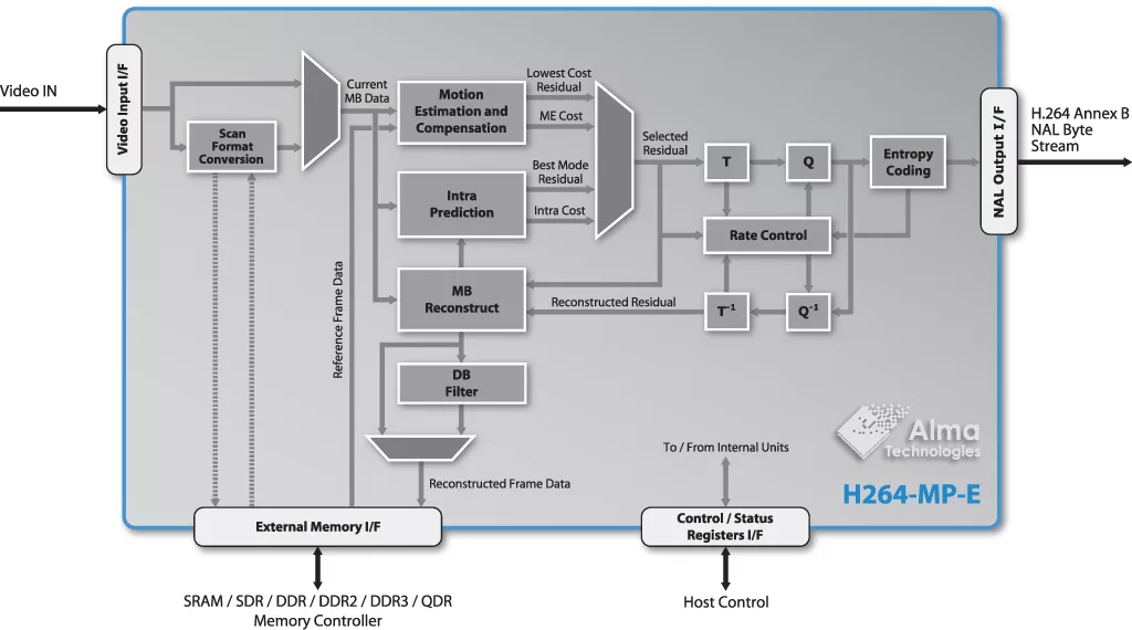 The H264-MP-E core is an self-contained hardware H.264 encoder that conforms to the ITU-T H.264 Main Profile.
