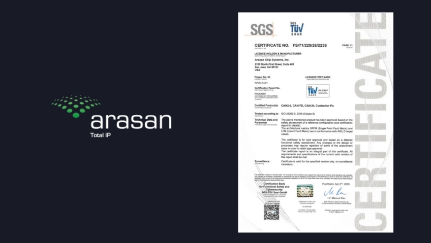 Arasan acheives the Industry's First ASIL-D Certification for its CAN XL IP Core 2026-04-22 08:19:00 IP Cores & Design