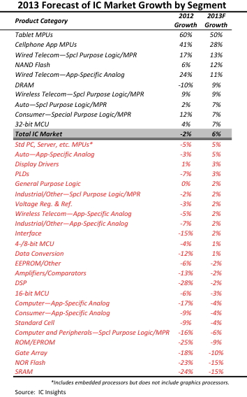 Consumer-driven mobile media devices, particularly smartphones and tablet computers, are forecast to keep the Tablet MPU (50%) and Cellphone Application MPU (28%) segments at the top of the growth list for the third consecutive year. Other IC categories that support mobile systems—including NAND flash (12%) and special-purpose logic devices—are expected to enjoy better-than-industry-average growth in 2013, as well.
