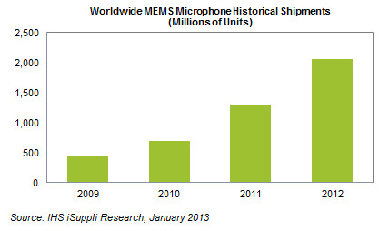 Shipments of MEMS microphones reached an estimated 2.06 billion units in 2012, up by a factor of 4.8 from 432.9 million units in 2009 according to an IHS iSuppli MEMS Market Brief from information and analytics provider IHS (NYSE: IHS).