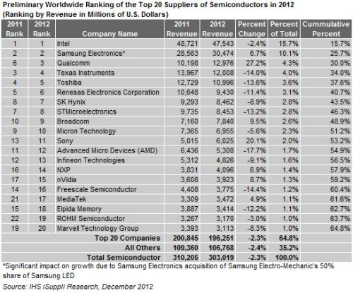 “In 2010, Qualcomm placed only No. 9 among global semiconductor suppliers,” Ford observed. “This six-rank ascent in two years represents the biggest increase of any major semiconductor supplier in recent history. With strong continuing growth expected in smartphone and tablet sales, Qualcomm is well positioned to benefit from the boost in wireless semiconductor revenue in the future.”
