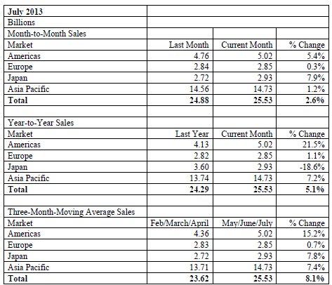 Regionally, July sales increased on a sequential monthly basis in Japan (7.9 percent), the Americas (5.4 percent), Asia Pacific (1.2 percent), and Europe (0.3 percent). Compared to the same month in 2012, sales in July increased sharply in the Americas (21.5 percent), solidly in Asia Pacific (7.2 percent), and modestly in Europe (1.1 percent), but fell steeply in Japan (-18.6 percent), largely because of the devaluation of the Japanese yen.