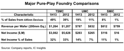In 2012, only TSMC, GlobalFoundries, and UMC had significant sales of ≤45nm technology. In 2013, TSMC is expected to have about 4x the dollar volume sales at ≤45nm as compared to GlobalFoundries and about 12x the ≤45nm sales of UMC ($10.33 billion for TSMC, $2.53 billion for GlobalFoundries, and $0.89 billion for UMC). In contrast, SMIC only entered initial production of its 45nm technology in early 2012, more than three years after TSMC first put its 45nm process into production and is forecast to sell only $0.22 billion of ≤45nm technology this year. In fact, only 22% of UMC’s 2013 revenue and 11% of SMIC’s 2013 sales are forecast to come from devices having ≤45nm feature sizes, which is why their revenue per wafer is so low as compared to TSMC and GlobalFoundries.