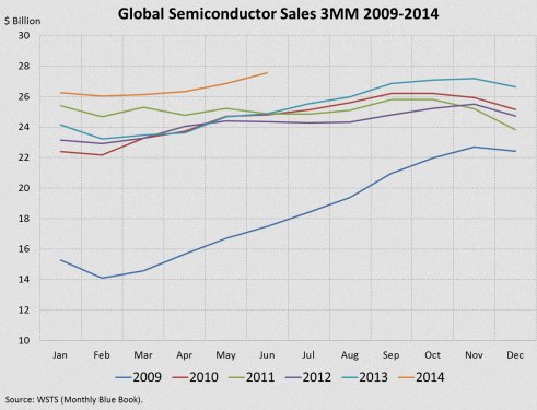 The orange line in the table below shows how monthly semiconductor sales performance in the first half of 2014 has been above the pace of the previous five years. Particularly noteworthy is the strength of sales in April, May, and June. (Note, all monthly sales figures in the table represent a three-month moving average). [Source: World Semiconductor Trade Statistics (WSTS) data]