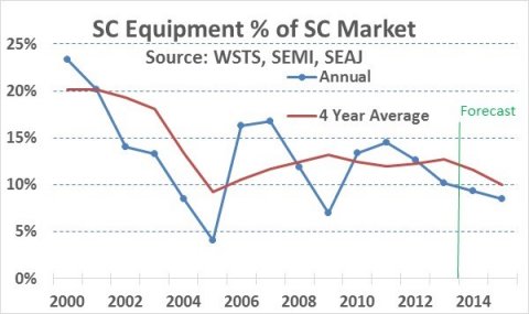 The bigger risk is capital and equipment spending not keeping up with market growth. Our February forecast was for 10% semiconductor market growth in 2014. Assuming 10% growth in both 2014 and 2015 and no change in equipment spending in 2014 and 2015, the four-year-average ratio would drop to 10% in 2015, implying under-capacity. However we do not believe this will occur. We expect companies to increase their equipment purchases in response to solid market growth.