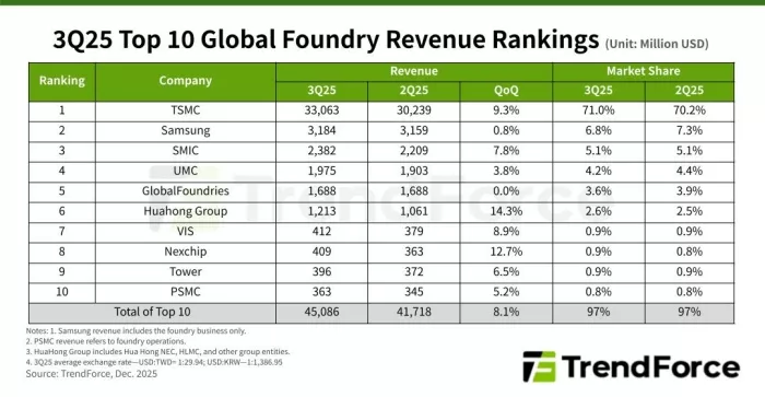 December 12, 2025 -- TrendForce’s latest research indicates that the global foundry industry continued to profit in 3Q25, fueled by strong demand for AI in HPC and new consumer-electronics chips and IC peripherals. Revenue was primarily driven by advanced processes at 7 nm and below, with support from high-value wafers. Chinese foundries also expanded their business through supply-chain diversification. As a result, total revenue for the top 10 foundries increased by 8.1% QoQ to nearly US$45.1 billion.
