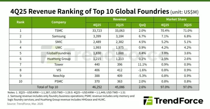 AI Demand Drives 4Q25 Global Top 10 Foundries Revenue Up 2.6% QoQ; Samsung Gains Share and Tower Moves Up in Rankings