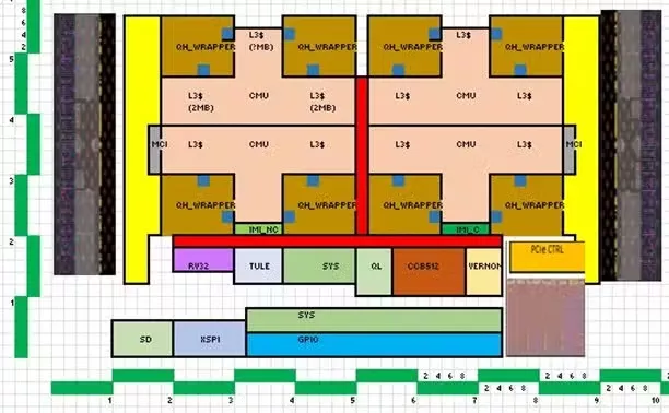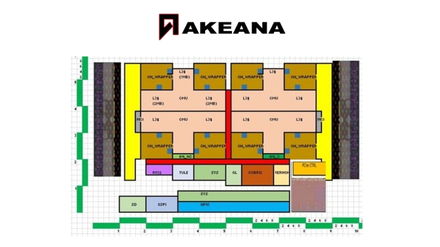 - The floorplan below reflects the Alpine test chip. It is comprised of the following key Akeana IP: