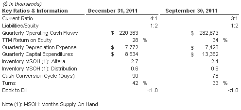 Cash flow from operating activities in 2011 was $959.6 million. Altera ended the quarter with $3.5 billion in cash and investments.Altera's board of directors has declared a quarterly cash dividend of $0.08 per share payable on March 1, 2012 to stockholders of record on February 10, 2012.