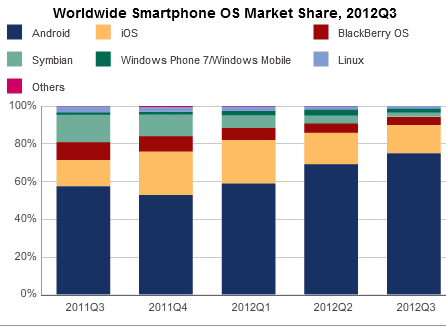 FRAMINGHAM, Mass. November 1, 2012 – The Android smartphone operating system was found on three out of every four smartphones shipped during the third quarter of 2012 (3Q12). According to the International Data Corporation (IDC) Worldwide Quarterly Mobile Phone Tracker, total Android smartphone shipments worldwide reached 136.0 million units, accounting for 75.0% of the 181.1 million smartphones shipped in 3Q12. The 91.5% year-over-year growth was nearly double the overall market growth rate of 46.4%.