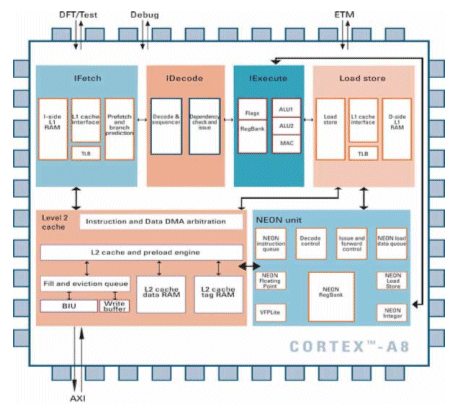 The Cortex-A8 processor is ARM’s first superscalar processor featuring technology for enhanced code density and performance, NEON™ technology for multimedia and signal processing, and Jazelle® RCT (Runtime Compilation Target) technology for efficient support of ahead-of-time and just-in-time compilation of Java and other bytecode languages.