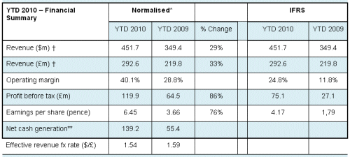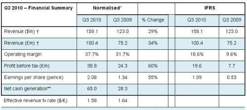 Total dollar revenues in Q3 2010 were $158.1 million, up 29% versus Q3 2009. Q3 sterling revenues of £100.4 million were up 34% year-on-year.