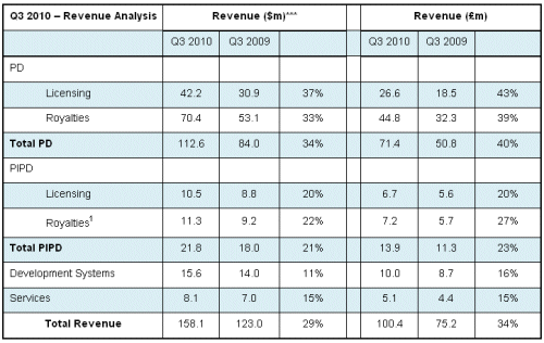 Total dollar royalty revenues in Q3 2010 increased year-on-year by 31% to $81.7 million, representing 52% of group revenues. Royalty revenues comprised $70.4 million from PD and $11.3 million from PIPD.