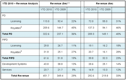 Total dollar license revenues in Q3 2010 increased by 33% year-on-year to $52.7m, representing 33% of group revenues. License revenues comprised $42.2 million from PD and $10.5 million from PIPD.