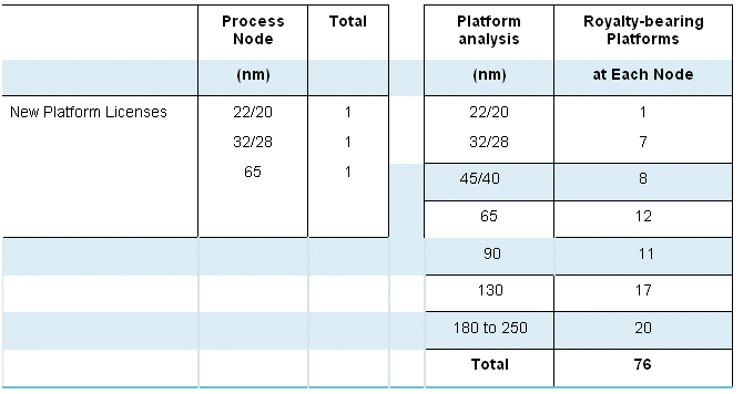 - 3 licenses for royalty-bearing platforms of physical IP at advanced nodes and mature nodes including TSMC licensing physical IP for 28nm and 20nm, as previously reported.