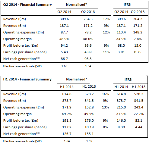 Total dollar revenues in Q2 2014 were $309.6 million, up 17% versus Q2 2013. Q2 sterling revenues of £187.1 million were up 9% year-on-year.