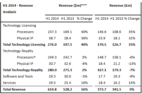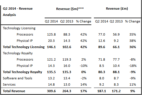 Total dollar licence revenues in Q2 2014 increased by 42% year-on-year to $146.1 million, representing 47% of Group revenues. Licence revenues comprised $125.8 million from processor licences and $20.3 million from physical IP licences.