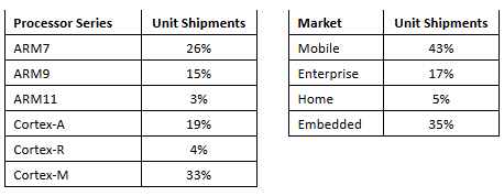 In Q2 2014 ARM's average royalty revenue per chip was 4.6 cents down from 5.0 cents one year ago. This is mainly due to low-cost ARM-based microcontrollers and smartcards growing faster than high-value chips into smartphones and tablets. In Q2 shipments of Cortex-A series processors were up about 25% year-on-year, whilst the growth of ARM based microcontrollers was nearly double this rate.