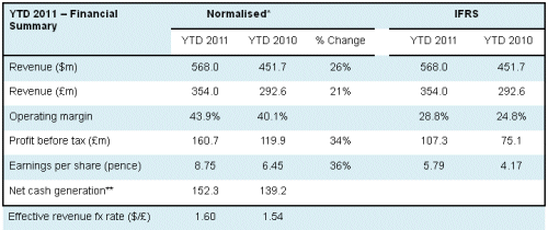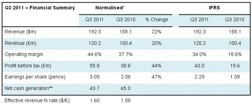 Total dollar revenues in Q3 2011 were $192.3 million, up 22% versus Q3 2010. Q3 sterling revenues of £120.2 million were up 20% year-on-year.