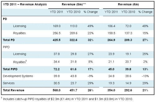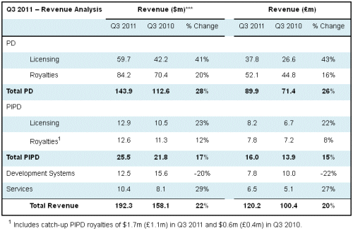 Total dollar license revenues in Q3 2011 increased by 38% year-on-year to $72.6m, representing 38% of group revenues. License revenues comprised $59.7 million from PD and $12.9 million from PIPD.