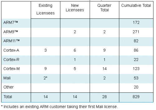 28 processor licenses, including 14 new customers, many of whom are established semiconductor companies buying their first ARM processor license