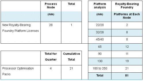 In Q3, ARM signed a physical IP license with UMC for a new 28nm royalty-bearing platform, extending the companies' decade-long partnership. This platform targets a wide range of applications that include portable devices, such as mobile and wireless devices, and high performance applications, such as digital home and high-speed networking. Cumulatively, 81 physical IP platform licenses have now been signed and it is this base of platform licenses that drives ARMâs future royalty potential.