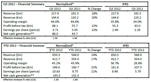 Profit before tax was £55.3 million in Q3 2012 compared to £43.0 million in Q3 2011. After adjusting for acquisition-related and share-based payment costs, and disposal and impairment of investments, normalised profit before tax in Q3 2012 was £68.1 million compared to £55.7 million in Q3 2011. The Group's effective normalised tax rate was 23.9% in Q3 2012 (IFRS: 25.3%) compared to 24.8% (IFRS: 27.0%) in Q3 2011. The Group’s effective normalised tax rate for the full year 2012 is estimated to be approximately 25%.