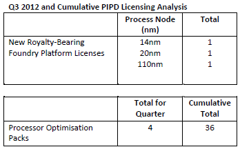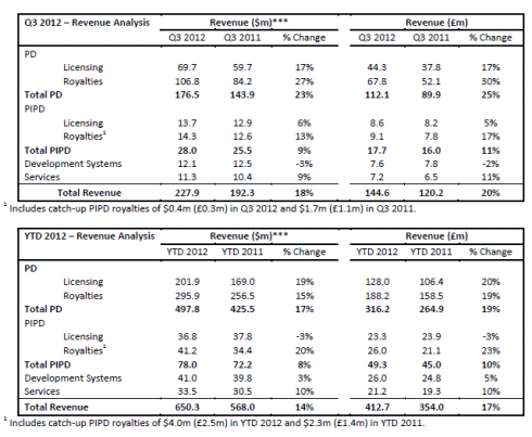 Royalties are recognised one quarter in arrears with royalties in Q3 generated from semiconductor unit shipments in Q2. Underlying PIPD royalties in Q3 2012 were $13.9 million, up 28% year-on-year.