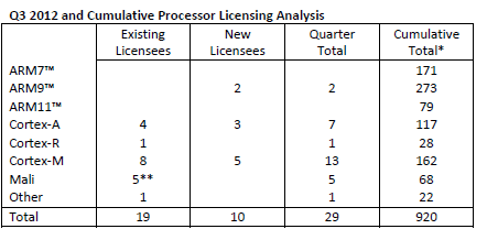 ARM also signed 5 licenses for its Mali graphics processors. Three of the five licenses were with companies taking their first Mali license from ARM.