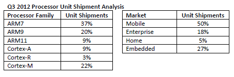 Cortex-A class processors now account for 9% of ARM’s total processor shipments, up from 5% one year ago. As well as carrying a higher royalty percentage, Cortex-A class processors are usually found in higher value chips. As a result, Cortex-A class chips comprise 9% of unit shipments and 35% of royalty value.