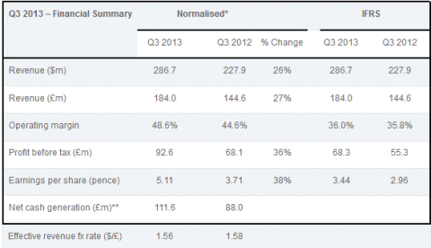 Total dollar revenues in Q3 2013 were $286.7 million, up 26% versus Q3 2012. Q3 sterling revenues of £184.0 million were up 27% year-on-year.