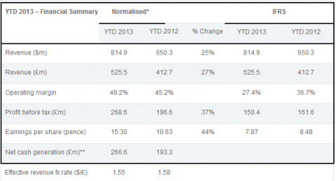 Profit before tax was £68.3 million in Q3 2013 compared to £55.3 million in Q3 2012. Normalised profit before tax in Q3 2013 was £92.6 millioncompared to £68.1 million in Q3 2012.The Group's effective normalised tax rate was 22.1% in Q3 2013 (IFRS: 28.9%) compared to 23.9% (IFRS: 25.3%) in Q3 2012. The Group’s effective normalised tax rate for the full year 2013 is estimated to be just under20%.