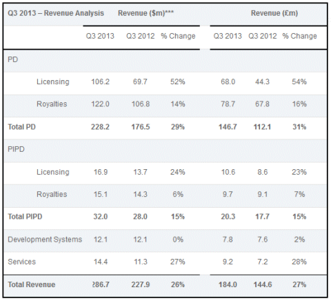 Royalties are recognised one quarter in arrears with royalties in Q3 generated from wafer shipments in Q2. PIPD royalties in Q3 2013 were $15.1 million, up 6% year-on-year.