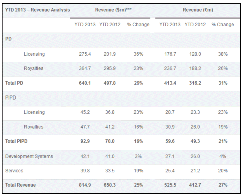 Royalties are recognised one quarter in arrears with royalties in Q3 2013 generated from semiconductor unit shipments in Q2 2013. Total dollar royalty revenues in Q3 2013 increased year-on-year by 13% to $137.1 million, representing 48% of group revenues. This compares with industry revenues decreasing about 2% in the shipment period1 (i.e. Q2 2013 compared to Q2 2012).
