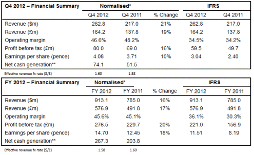 Total dollar revenues in Q4 2012 were $262.8 million, up 21% versus Q4 2011. Q4 sterling revenues of £164.2 million were up 19% year-on-year.
