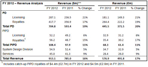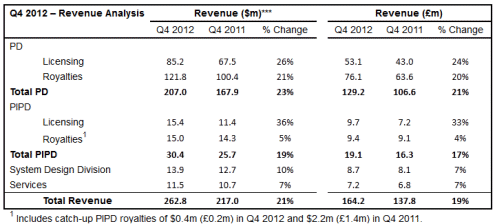 Royalties are recognised one quarter in arrears with royalties in Q4 2012 generated from semiconductor unit shipments in Q3 2012. Total dollar royalty revenues in Q4 2012 increased year-on-year by 19% to $136.8 million, representing 52% of group revenues. Royalty revenues comprised $121.8 million from PD and $15.0 million from PIPD. PD dollar royalty revenues in Q4 2012 increased 21% year-on-year. This compares with industry revenues which were down 3% over the relevant shipment period (i.e. Q3 2012 compared to Q3 2011).