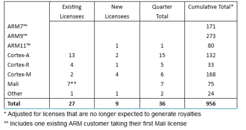 ARM also signed seven licenses for its Mali graphics processors for use in entry-level and high-end smartphones, mobile computing, consumer electronics and automotive infotainment, including one new licensee for ARM’s Mali technology.