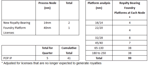 During the quarter ARM signed three further royalty bearing platforms licenses. These included two more licenses for 14nm FinFET and another platform license with a leading foundry at 40nm. ARM has now signed a total of 99 platform licenses.