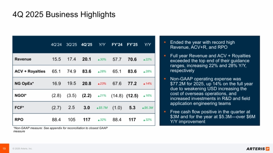 CAMPBELL, Calif., Feb. 12, 2026 -- Arteris, Inc. (Nasdaq: AIP), a leading provider of semiconductor technology for accelerating innovation in the AI era, today announced financial results for the fourth quarter and year ended December 31, 2025 and provided estimated first quarter and full year 2026 guidance.