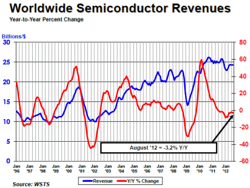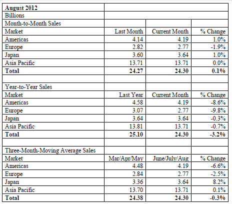 WASHINGTON, D.C.—Oct. 2, 2012—The Semiconductor Industry Association (SIA), representing U.S. leadership in semiconductor manufacturing and design, today announced that worldwide sales of semiconductors reached $24.30 billion for the month of August 2012, a slight increase of 0.1 percent from the previous month when sales were $24.27 billion and a 3.2 percent decrease from the August 2011 total of $25.1 billion. Year-to-date sales reached $189.46 billion in August 2012, down 4.6 percent compared to the same time last year.