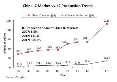 China's total IC production is forecast to represent only 6% of the worldwide IC market in 2017.
