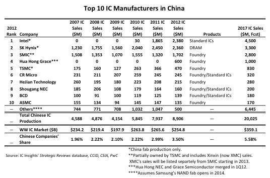 Foreign IC Companies to Represent 70% of China's IC Production in 2017, Up From 58% in 2012