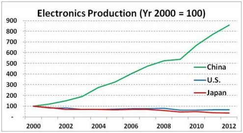 The growth of Asia Pacific from 25% of the world in 2000 to 56% in 2012 is impressive, but does not fully show the relative growth of China. China is becoming a larger portion of the Asia Pacific region. While China’s electronic production grew over eight times from 2000 to 2012, Taiwan’s electronics production was roughly the same level in 2012 as in 2000.
