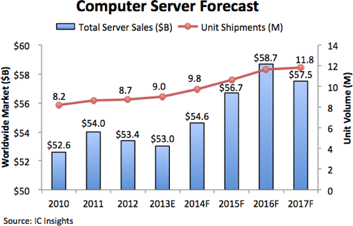 December 18, 2013 -- Computer servers have been the workhorses of the Internet and data networks for two decades, responding to requests for services and files from a growing range of end-user systems that demand quick access to data, video, audio, web pages, and search engines. Price erosion and the weak global economy have lowered server sales volumes in the past two years, but this computer market is expected to see a modest rebound in 2014 with worldwide revenues rising about 3% to $54.6 billion, followed by stronger growth in 2015 and 2016, according to IC Insights’ new 2014 edition of IC Market Drivers—A Study of Emerging and Major End-Use Applications Fueling Demand for Integrated Circuits.
