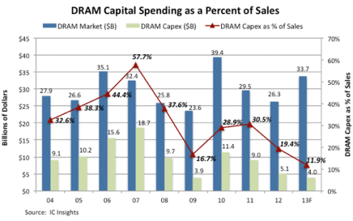 DRAM capex as a percent of sales forecast to fall to all-time low in 2013.