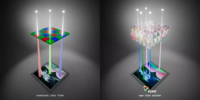 Eyeo introduces a novel image sensor architecture that eliminates the need for traditional color filters, making it possible to maximize sensitivity without increasing sensor size. Leveraging breakthrough vertical waveguide-based technology that splits light into colors, eyeo develops sensors that efficiently capture and utilize all incoming light, tripling sensitivity compared to existing technologies. This is particularly valuable in low-light environments, where current sensors struggle to gather enough light for clear, reliable imaging. Additionally, unlike traditional filters that block certain colors (information that is then interpolated through software processing), eyeo’s waveguide technology allows pixels to receive complete color data. This approach instantly doubles resolution, delivering sharper, more detailed images for applications that demand precision, such as computational photography, machine vision, and spatial computing.